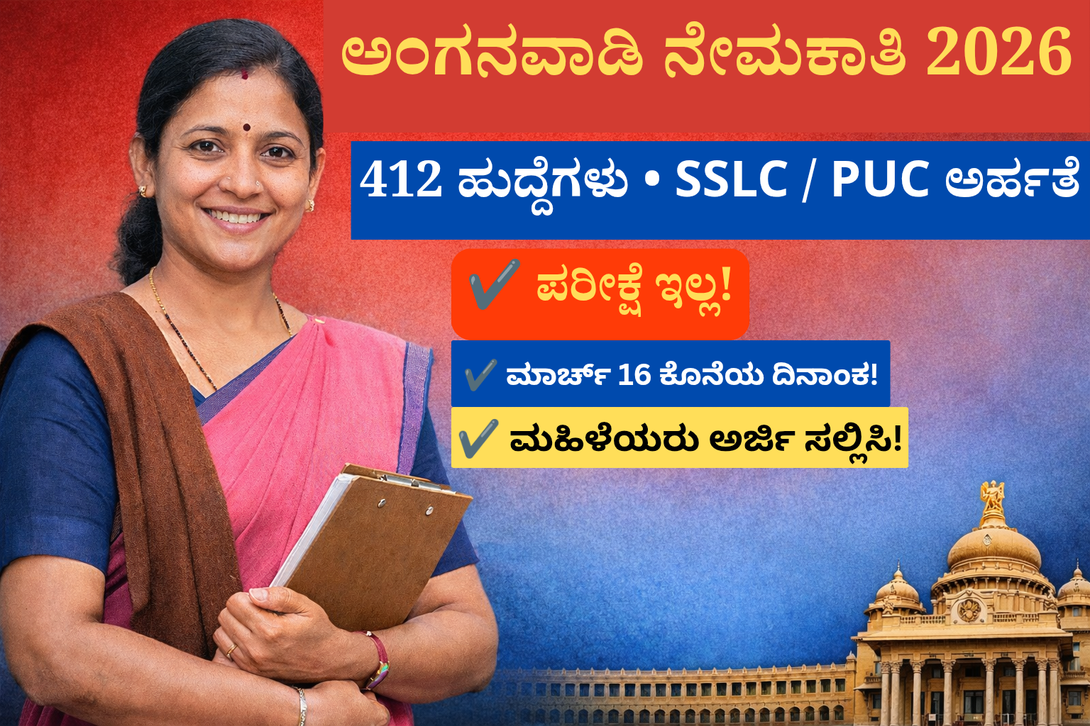 ಕರ್ನಾಟಕದ ಮಹಿಳೆಯರಿಗೆ ಮತ್ತೊಂದು ದೊಡ್ಡ ಉದ್ಯೋಗ ಅವಕಾಶ ಲಭ್ಯವಾಗಿದೆ. ಮಹಿಳಾ ಮತ್ತು ಮಕ್ಕಳ ಅಭಿವೃದ್ಧಿ ಇಲಾಖೆ ವತಿಯಿಂದ 2026ನೇ ಸಾಲಿನ Anganwadi ನೇಮಕಾತಿ ಅಧಿಸೂಚನೆ ಪ್ರಕಟಿಸಲಾಗಿದೆ. ಈ ನೇಮಕಾತಿಯಡಿ ಒಟ್ಟು 412 ಕಾರ್ಯಕರ್ತೆ ಮತ್ತು ಸಹಾಯಕಿ ಹುದ್ದೆಗಳು ಭರ್ತಿ ಮಾಡಲಾಗುತ್ತಿದೆ.