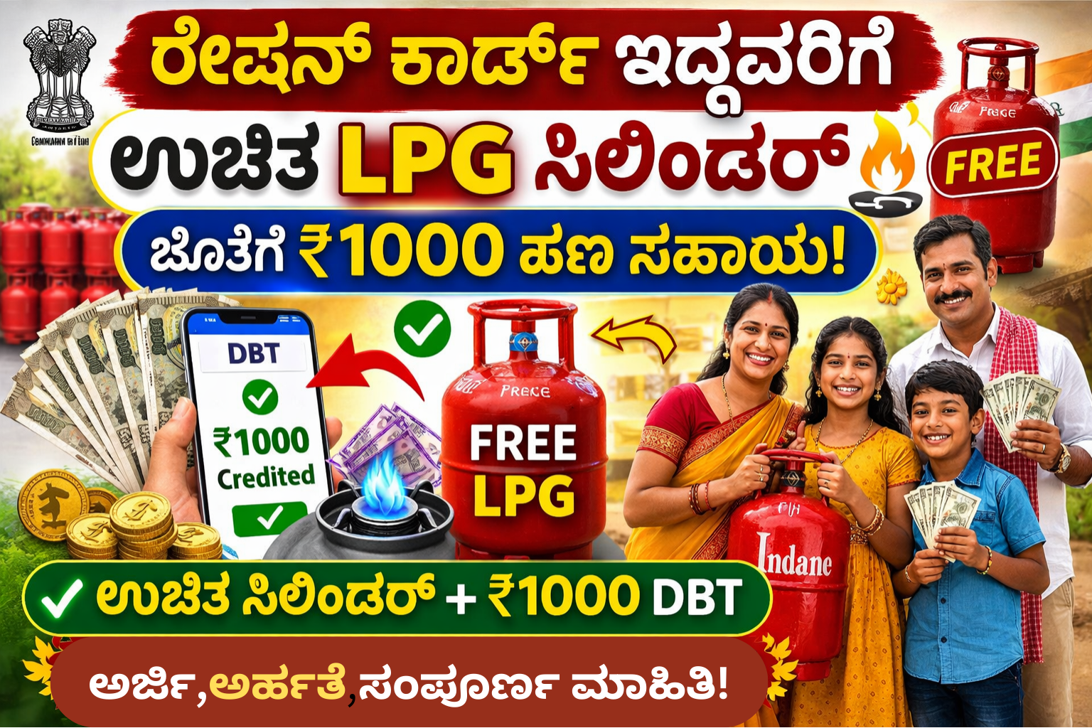 2026ರಲ್ಲಿ ರೇಷನ್ ಕಾರ್ಡ್ ಹೊಂದಿರುವವರಿಗೆ ಉಚಿತ LPG ಸಿಲಿಂಡರ್ ಮತ್ತು ₹1000 ಹಣ ಸಹಾಯ ಯೋಜನೆ ದೊಡ್ಡ ಆರ್ಥಿಕ ನೆರವಾಗಿದೆ. ಈ ಯೋಜನೆ ವಿಶೇಷವಾಗಿ ಬಡ ಮತ್ತು ಮಧ್ಯಮ ವರ್ಗದ ಕುಟುಂಬಗಳಿಗೆ ಅಡುಗೆ ವೆಚ್ಚ ಕಡಿಮೆ ಮಾಡಲು ಮತ್ತು ದಿನನಿತ್ಯದ ಖರ್ಚು ನಿರ್ವಹಿಸಲು ಸಹಾಯ ಮಾಡುತ್ತದೆ.