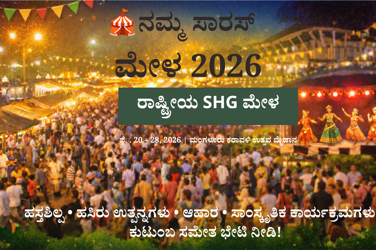 ಫೆಬ್ರವರಿ 20ರಿಂದ 28 ರವರೆಗೆ ಮಂಗಳೂರು ಕರಾವಳಿ ಉತ್ಸವ ಮೈದಾನವು “ನಮ್ಮ ಸಾರಸ್ ಮೇಳ 2026” ರಾಷ್ಟ್ರೀಯ SHG ಮೇಳಕ್ಕೆ ಮನೆಮಾತಾಗಲಿದೆ. ಈ ಮೇಳವು ದೇಶದ ವಿವಿಧ ಭಾಗಗಳಿಂದ ಶ್ರೇಷ್ಠ ಹಸ್ತಶಿಲ್ಪಗಳು, ಹಸಿರು ಉತ್ಪನ್ನಗಳು, ವಸ್ತ್ರಗಳು ಮತ್ತು ಆಹಾರ ವಸ್ತುಗಳನ್ನು ಪ್ರದರ್ಶಿಸುವ ರಾಷ್ಟ್ರೀಯ ಮಟ್ಟದ ಕಾರ್ಯಕ್ರಮವಾಗಿದೆ.